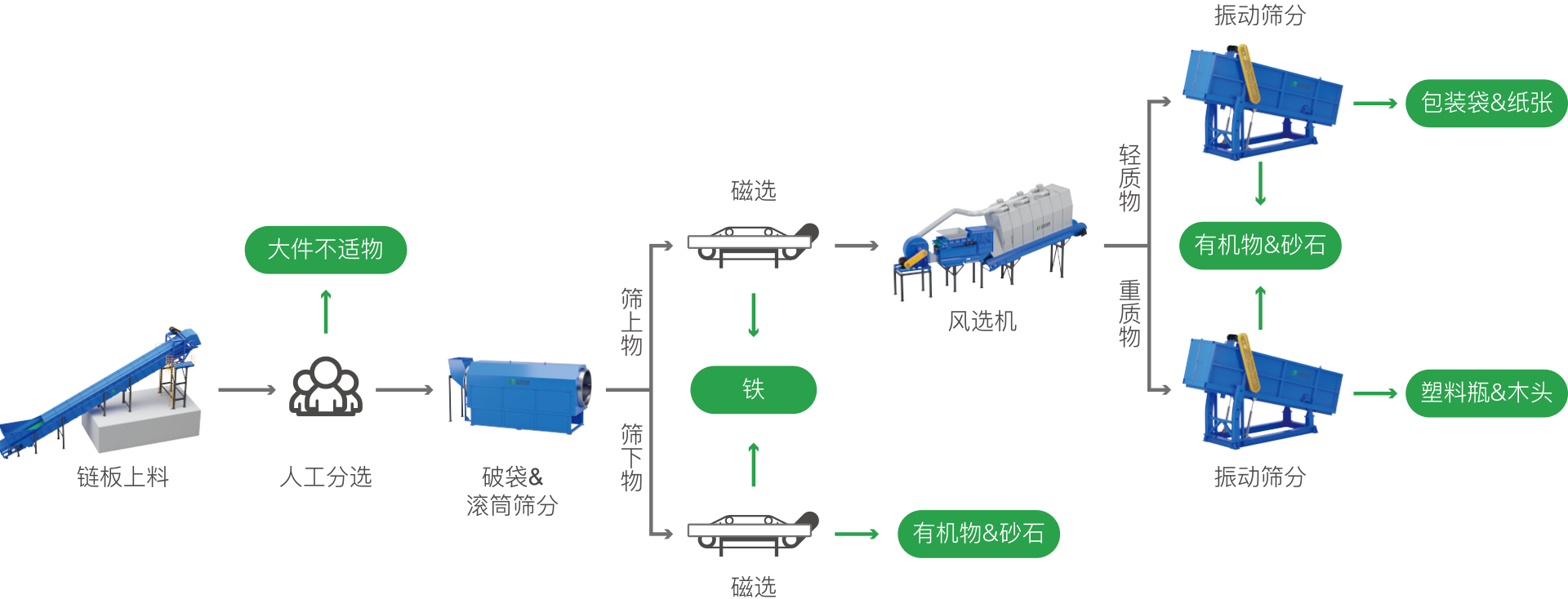 生活垃圾一般可分為廚余垃圾、可回收垃圾、有毒有害垃圾和其他垃圾等。通過(guò)多種分選設(shè)備組合,從混合垃圾中高效地提取出有機(jī)物、塑料、金屬、石頭等。分揀后的不同組分會(huì)被儲(chǔ)存,并可進(jìn)一步循環(huán)利用。