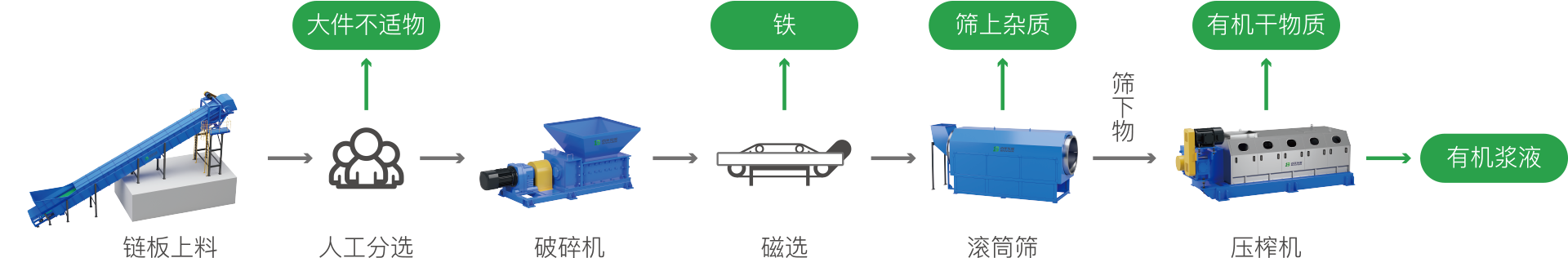有機(jī)垃圾又稱濕垃圾,是指生活垃圾中含有有機(jī)物成分的廢棄物。對(duì)有機(jī)垃圾進(jìn)行機(jī)械破碎、滾筒篩分、擠壓脫水等預(yù)處理工藝,再協(xié)同厭氧、堆肥、焚燒等資源化、無(wú)害化處理。
